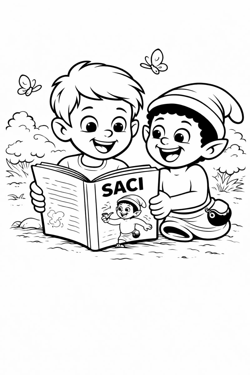 Confira este desenho de Saci-Pererê para imprimir e colorir. Abra o arquivo em alta qualidade no botão Imprimir desenho ou use Personalizar para adicionar texto e molduras.